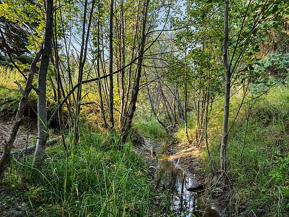 Set on a beautiful, expansive 13.6-acre lot, this property boasts a mix of meadows and majestic 100-foot-tall Tamarack trees, creating a picturesque and serene setting.