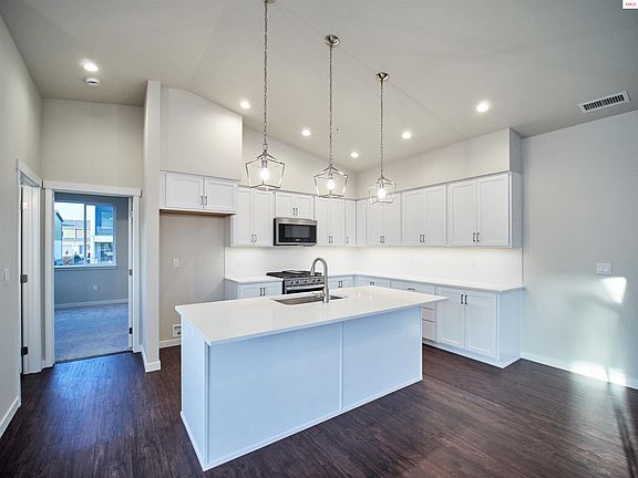 New construction home features beautiful, timeless finishes like white quartz countertops, deep umber colored LVP floors through main and wet rooms with a full white tile backsplash. Enjoy double sink master vanity and tiled wall shower w/ glass door, beautiful SS appliance package, gas forced air heat with central A/C, radon system and a heated garage with epoxy floors! Enjoy vaulted living ceilings w/ many windows, it's open and bright. This home has a large walkout deck provides sunset views while entertaining. Front windows frame south mountain views over the green belt with its community garden and dog park. Located 12 minutes to KMC in CdA; 25 mins to Sacred Heart in DT Spokane. This is a limited opportunity to stake your claim in a 32-acre mixed use neighborhood called Millworx, that sits on a redeveloped mill site minutes to I90, the Spokane River, shopping, dining, and recreation.