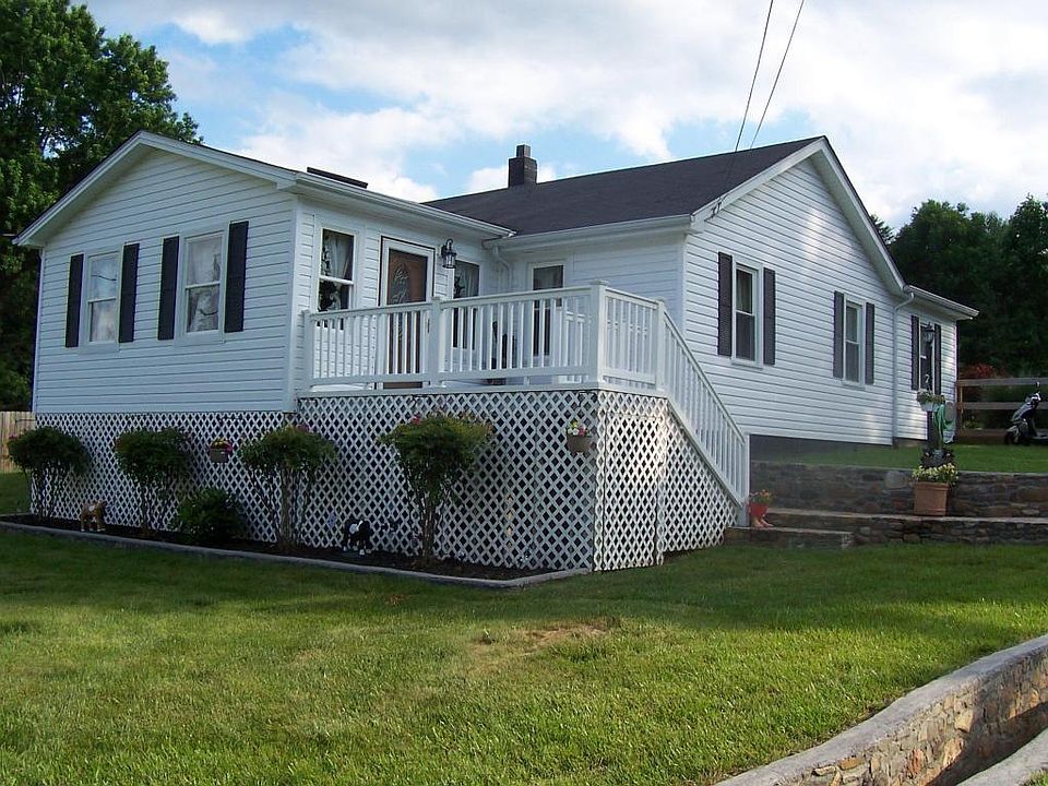 NEW in last 7 years: House gutted, new walls,floors,plumbing. All electric removed & new installed,circuit breaker box. 50gal water heater. 2 gas FP's, skylights, vaulted ceiling, 2 decks (composite wood),new kitchen, new 3 ton heat pump,speaker system 3 rooms. Natural woodwork, wood doors,some crown molding. New roof. Instant hot water in kit. Detached 20x24 gar. has elec,wood stove,satellite TV.
