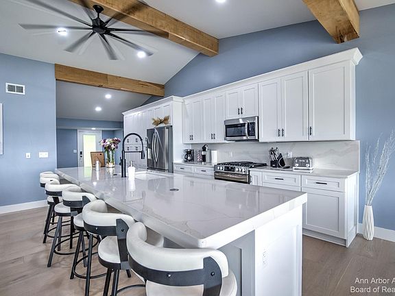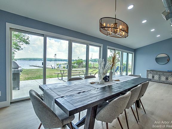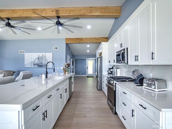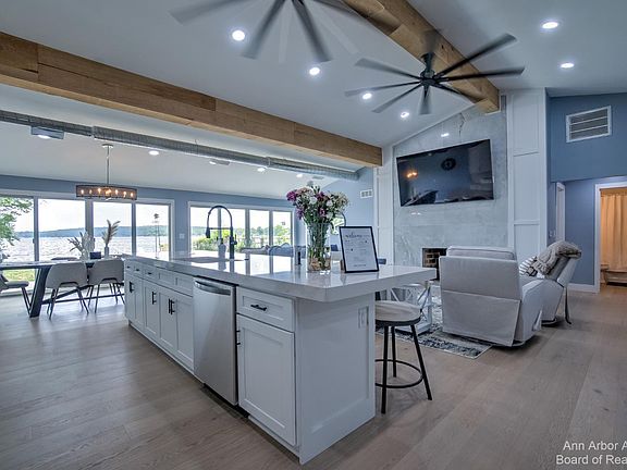 Offer Deadline Monday, August 28th at 8pm This Portage Lake ranch will take your breath away! Updated from top to bottom, Luco Lodge will delight even the most discerning buyers. The open concept living areas feature hardwood wide plank white oak flooring throughout and a brand new kitchen with quartz countertops and an eleven foot island with breakfast bar seating for six. The dedicated dining space overlooking the lake seats eight to ten comfortably. The great room has a floor-to-ceiling fireplace with marble tile surround as a focal point and stunning rough sawn white oak wrapped beams that draw the eye upward. Highlights are three spacious bedrooms including a master suite with custom wooden accent wall, ensuite with ceramic tile shower and quartz vanity, and sliding glass door to the patio. Loaded with built-in storage, modern lighting, and tasteful wainscoting. You'll love the additional quarter acre lot featuring a 704 square foot heated outbuilding with two car garage, workshop, and potential for finished loft space. Three wide door walls to the lakeside make entertaining easy. All new: patio, roof, black frame replacement windows, and newer HVAC. The 60' dock stays., Primary Bath
