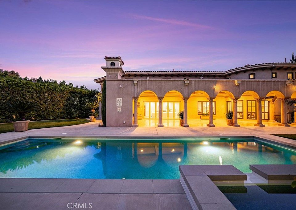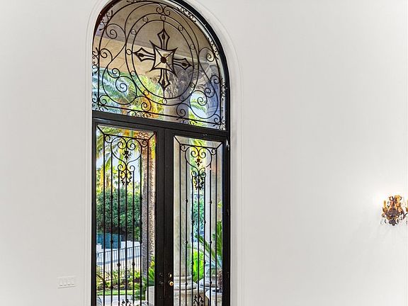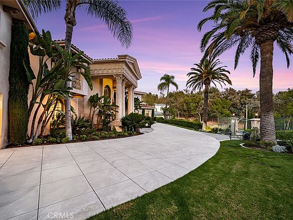 Stunning gated estate in prestigious Villa Park. This once in a lifetime gem known for its exquisite all plaster exterior, grand portico with stunning Venetian columns and ornate iron entry doors that set the stage for the masterpiece of luxury and sophistication that define this stunning home. With 7632 square feet of living space spanning an unprecedented 39,030 sqft lot, this estate offers an unparalleled living experience with all the comforts of home. The grand staircases are adorned in gold leaf accents on wrought iron with a crystal chandelier above and sconces lining the walls of each flight and hand plastered walls are found t/o. An exquisite library off the entry is a true draw with its wainscot walls and gorgeous coffered ceilings. Adjacent is the formal dining room with a custom painted arched ceiling and french door access to the serene outdoor setting. The newly built kitchen is a true showstopper as sleek waterfall quartz cascades vertically over the islands edge. Appliances include double dishwashers, a six burner range with double ovens, additional built in oven, microwave, warming door and refrigerator. Entertaining is effortless in the expansive great room with its dual sitting areas, wine cellar a wonderfully placed long bar with built in storage racks, wine refrigerator, sink and an abundance of cabinetry. The five bedrooms offered includes one main floor bedroom with private access and an en-suite with it's own egress to the splendor of the private outdoor setting. A residential elevator ensures comfortable access to every level. The primary suite is accessed via a private corridor lined with crystal sconces and an arched tray ceiling. The suite includes a sitting room with fireplace, an office, French doors to a balcony with serene views, two well planned walk-in closets, a private sauna, a spa style walk-in shower, a freestanding tub, and abundance of beautiful cabinetry. Another wonderful sitting room with fireplace plus 3 more bedrooms all with en-suites, a gym area, and two balconies each with views, complete the second floor. Whether you're relaxing by the pool or entertaining guests under the logia with its glistening travertine flooring, this timeless estate offers tranquility and style. Every corner of this home speaks to a refined sense of taste and a commitment to comfort. From the Venetian inspired design elements to the cutting edge remodel, this estate is truly a rare find where classic luxury meets modern convenience.