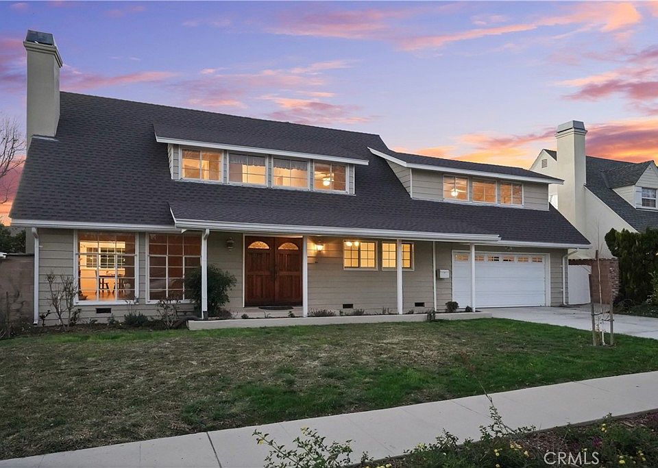 This Signature Tract mid century Cape Cod home is situated on a quiet street in a coveted Chatsworth community; neighboring Northridge and Porter Ranch shopping, dining and entertainment. This charming home features four bedrooms, two bathrooms, 2,192 sq. ft. of living space, located on a generous 7,560 sq. ft. lot, a two car attached garage and a new concrete driveway. The handsome curb appeal and inviting front porch welcomes you to the double door entry, boasting a spacious Living Room with floor to ceiling windows, lovely original hardwood floors, a cozy fireplace with raised hearth and a mantle, and an adjacent Dining room with chandelier. The updated Cooks Kitchen offers stainless steel appliances, a gas range/oven, a Bosch dishwasher, a Viking microwave; tons of cabinet storage, a pantry, Corian style countertops, oak wood floors, and a Family room sitting area with sliding door to the patio. One of the four bedrooms is downstairs with generous closet space, hardwood floors, a ceiling fan and utilizes the downstairs 3/4 bathroom. Three spacious bedrooms are found upstairs; they share the remodeled full Hollywood bathroom with dual vanities and a subway tiled shower over tub. The private backyard is secured with block walls, enjoy entertaining and outdoor dining under the covered patio, drought tolerant landscaping, find your green thumb by growing your own vegetables in the garden boxes, and savor the fruit trees. There is a two car attached garage with a finished interior, an insulated roll up garage door with automatic opener, a laundry area with gas dryer hook up and storage. Improvements and amenities include hardwood floors, copper plumbing, a new composition roof in 2022, a new concrete driveway, twelve updated dual pane windows, newer Levolor blinds, rain gutters, central air and heat. Conveniently located nearby desirable shopping, restaurants and schools including the Northridge Mall, Porto's Bakery, The Vineyard's in Porter Ranch, Trader Joe's, Whole Foods, Superior Elementary School, Nobel Middle School, Chatsworth Charter HS, and Chaminade Middle School.