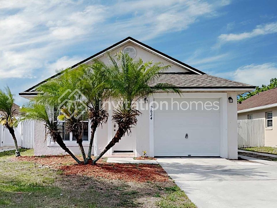 Home Features and Amenities: Air Conditioning, Fenced Yard, Garage, Long Lease Terms, Pet Friendly, Primary Bedroom on Main, Single Story House, Smart Home, Stainless Steel Appliances, Tile, Walk in Closet, W/D Hookups, and professionally managed by Invitation Homes.