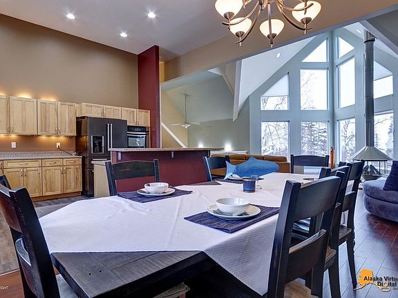Stuckagain Heights with style; open floor plan, granite countertops, soaring ceilings, gas fireplace, & large mstr suite. Downstairs 2 bedrooms set up for use as nightly rental. Large covered entertainment deck off dining area, paved driveway with room for RV parking. Wood shop tucked under entertainment deck. Secluded lot, mature trees, amazing sunsets, views of city/inlet. Recent improve-