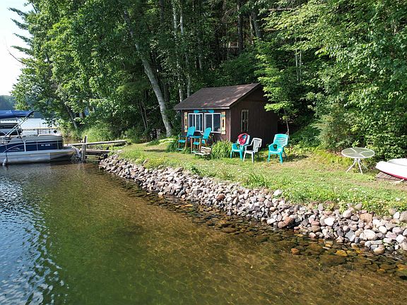 This exceptional Waterfront Estate is a rare and truly unique opportunity. With a total of 8 bedrooms and 6 bathrooms, along with additional accommodations in the 2 log guest cabins, this Deluxe Duplex is situated on over 2 acres with an astounding 475+/- feet of pristine frontage on Buskey Bay, one of seven interconnected lakes in the highly desirable Pike Chain of lakes near Iron River in far northern Wisconsin. A common entry from the expansive covered porch leads to two spacious units, each with these features: Two bedrooms, a Full bath and a Half bath for guests, a full, open concept kitchen with pantry, dining area, great room, and main floor laundry room. The lower level of each unit has Two bedrooms, a bathroom with a step-in shower, family room and large storage room. Thoughtful architectural accents in the home from the historic Log Cabin Lodge, along with the 2 authentic log cabins create a warm, nostalgic ambiance that honors the property’s legacy. From your own backyard enjoy endless recreational opportunities like boating, fishing, kayaking, swimming, or exploring the trails, forests, and lakes on your ATV or snowmobile. Located just about 10 minutes from downtown Iron River, 20 minutes to Lake Superior, and around 40 minutes to Duluth/Superior or Ashland. Whether you're seeking a multi-generational or multi-family retreat, a savvy investment, or a legacy property to share with generations, this estate delivers a blend of privacy, convenience, and natural beauty.