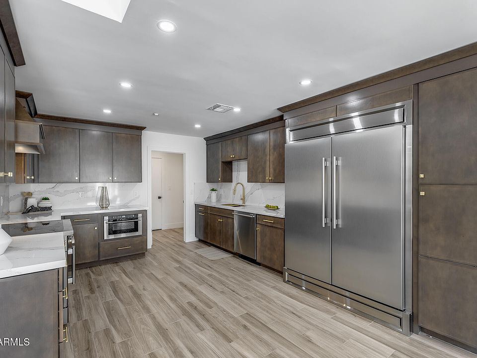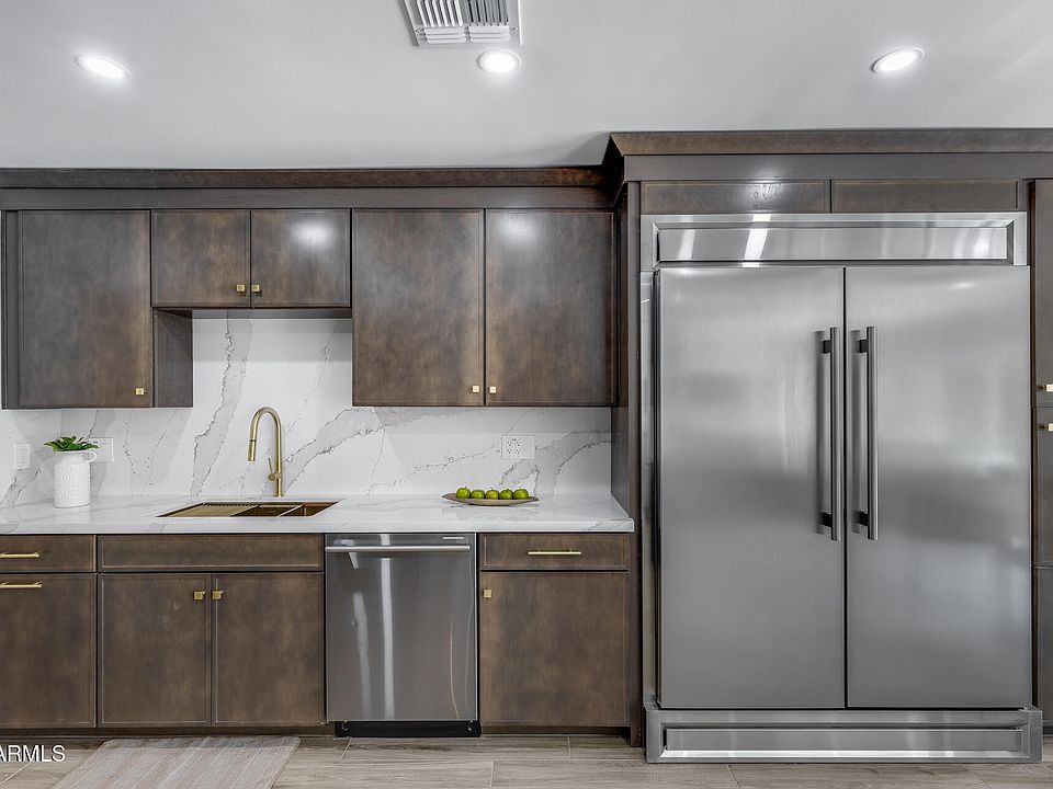 Luxury Living! This beautifully renovated 4-bed home blends style & functionality in Scottsdale's McCormick Ranch! The kitchen boasts white quartz countertops & backsplash, SS appliances & dark cabinetry, all set on premium porcelain tile throughout. A newly added primary suite is expansive & has backyard access, walk-in closet with built-ins & ensuite with double vanity, soaking tub & floor-to-ceiling tiled walls & shower. A second bedroom offers its own ensuite, plus other bedrooms & bathrooms have been freshly updated. Vaulted ceilings & abundant natural light create a bright, airy feel & a large sliding door opens to the backyard pool & patio. With walking & biking paths, playgrounds, tennis courts & golf—everything you need to enjoy the Arizona lifestyle in one home & community!