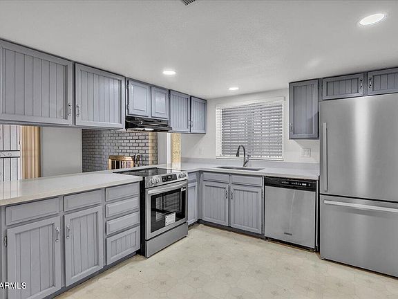 Large screened covered patioArizona roomGray cabinetsQuartz countertopsExtra storageVinyl plank flooringStainless steel appliances