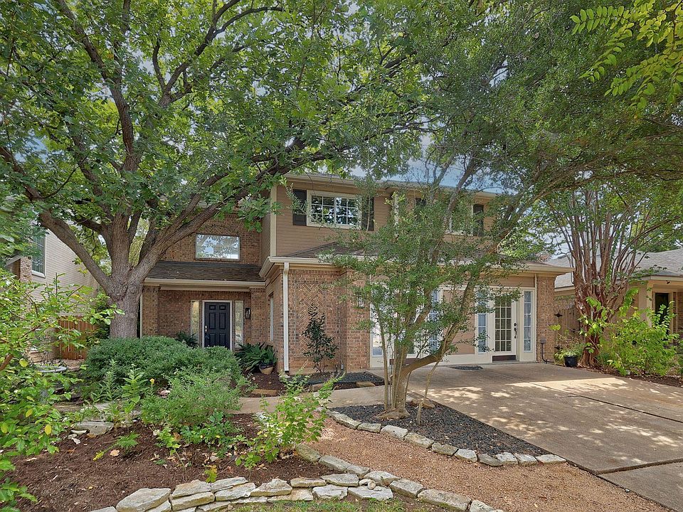 Gorgeous home framed by mature trees and native landscaping, perfectly situated on a low-traffic no-through street. Originally a model home, it showcases beautiful architectural details throughout, including soaring ceilings, curved edges, and elegant built-in niches. Expansive windows, including dramatic clerestory windows, fill the home with natural light and offer peaceful tree views from nearly every room. The spacious floor plan features 3 living areas: a family room with a 3-sided gas log fireplace, a private study with custom cabinetry, and a versatile game room with a bar that could serve as a playroom or media room. The updated kitchen offers abundant cabinetry, quartz counters, a large island with breakfast bar, and recent Samsung appliances. Modern updates include luxury vinyl plank floors, new lighting/plumbing fixtures and shutters, with no carpet on the first floor. The primary suite provides a large sitting area ideal for a desk, reading nook, exercise space, or nursery, along with a generous his-and-hers walk-in closet. Secondary bedrooms also feature large closets, built-in bookcases, and additional cabinetry. Recent major improvements include new furnaces and ducts (2021), Andersen sliding patio door (2021), impact-resistant roof and gutters (2022), bathroom sinks (2022), upstairs carpet replaced with pet-friendly Berber (2023), shed (2023), fresh paint (2024), and partial siding replacement (2025). The backyard is a private oasis with a covered patio, ceiling fan, tranquil koi pond with lilies, lush native landscaping, and an oversized 8’ bamboo fence for maximum privacy, all attracting butterflies and birds. A sprinkler system services both the front and backyard. This ideal location offers quick access to The Domain, Apple and Austin FC Stadium, plus an incredible selection of nearby restaurants,and shopping, with easy routes to 183, Mopac, Hwy 45, and Parmer. This home also tracks to Round Rock ISD and is just blocks from neighborhood parks.