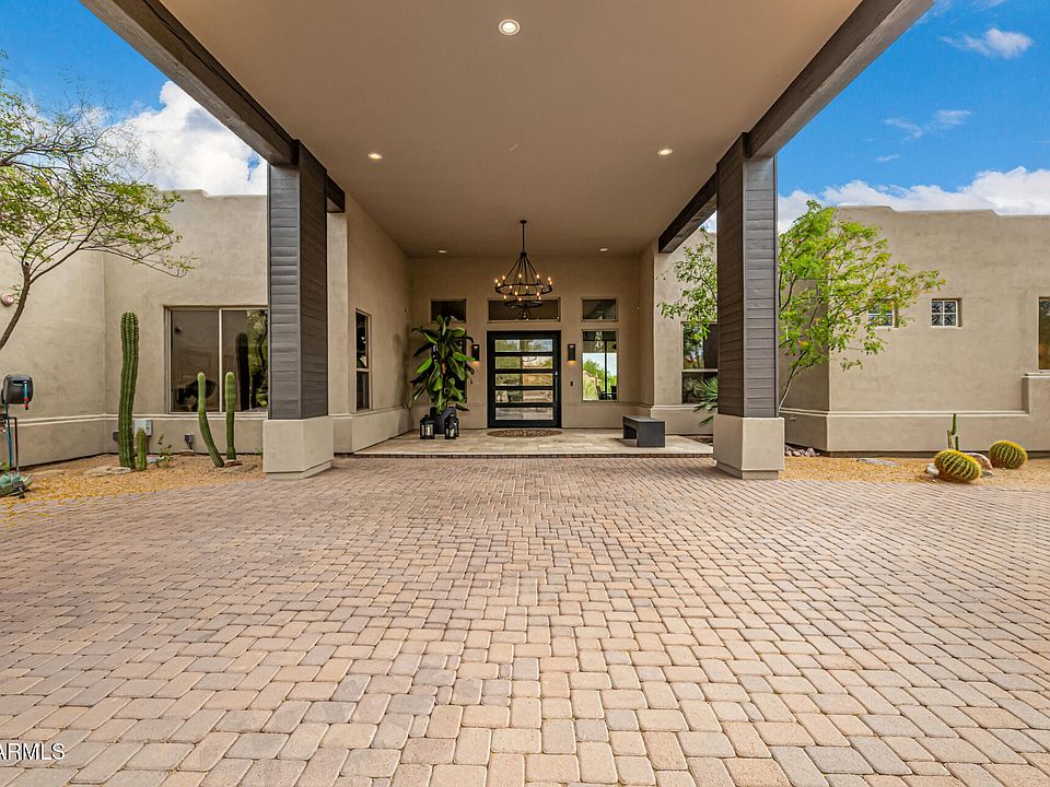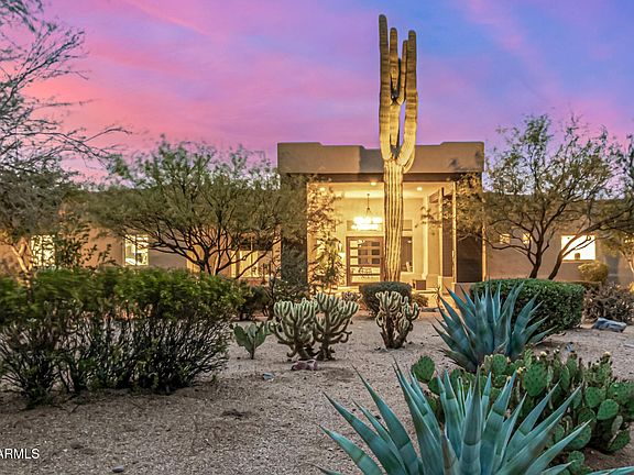 Spectacularly designed estate overlooking DC Ranch with Mountain View's and city lights. The grand entry leads to a huge pivot door. The blonde wood floors and soaring ceilings opens to a wall of frameless windows and a huge great room. No expense was spared with a waterfall kitchen island, gas cooking, built in refrigerator and designer backsplash. Perfectly placed fireplace with floor to ceiling ship lap wall. The primary has an its own wall of windows, dual floating vanities, back lit mirror, double closet and glass tile walk in shower. The offices custom wood accent wall is a great space to focus. High above the valley, the negative edge pool, elevated spa, travertine pavers and a built-in grill make this ideal for entertaining. The views are sensational.