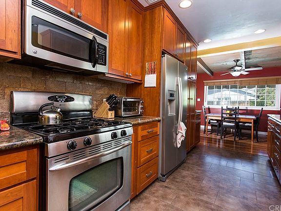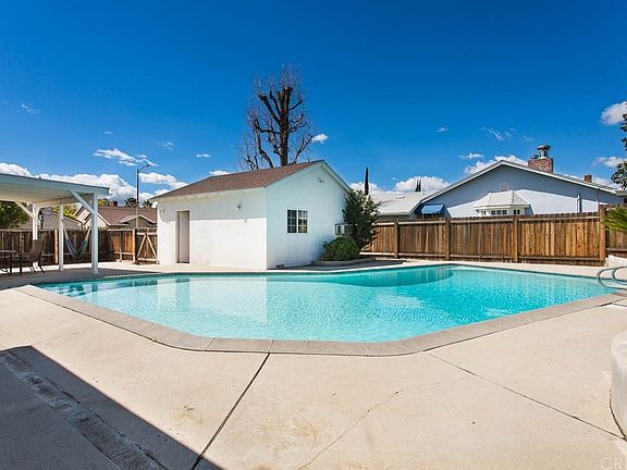 This exceptional pool home is situated in a friendly Northridge neighborhood features handsome curb appeal, four bedrooms, three bathrooms, 1,792 square feet of living space and a two-car detached garage. The relaxing front porch invites you into an open floor plan, a charming living room enhanced by a handsome full brick wall fireplace, open wood beam ceiling, built in shelves, and superb laminate floors. The dining room boasts wood beam ceilings, a ceiling fan and a view of the backyard and pool. The galley kitchen offers granite counters, plenty of custom cabinet space with pull-out drawers and shelves, tile floors, gas range and oven, microwave oven, dishwasher, and recessed lighting. The adjacent laundry room has gas dryer hook-up. The spacious master bedroom boasts carpet flooring, a ceiling fan, mirrored closet raised panel door, an en suite three-quarter bathroom with a single sink vanity, tiled stall shower and floors. Two family bedrooms feature a ceiling fan, wooden blinds and carpet floors. The hallway full bathroom boasts a lovely double sink vanity and cabinet, tile floors and shower over tub. The fourth bedroom offers carpet floors, a ceiling fan, closet, wooden blinds and access to a tiled one-half bathroom. Upgrades include central air and heating, copper plumbing, double pane windows, and raised panel doors. Relax and enjoy the large fenced and private back yard, sparkling swimming pool and covered patio. Convenient to shopping, freeways and schools.