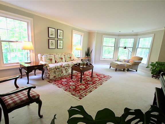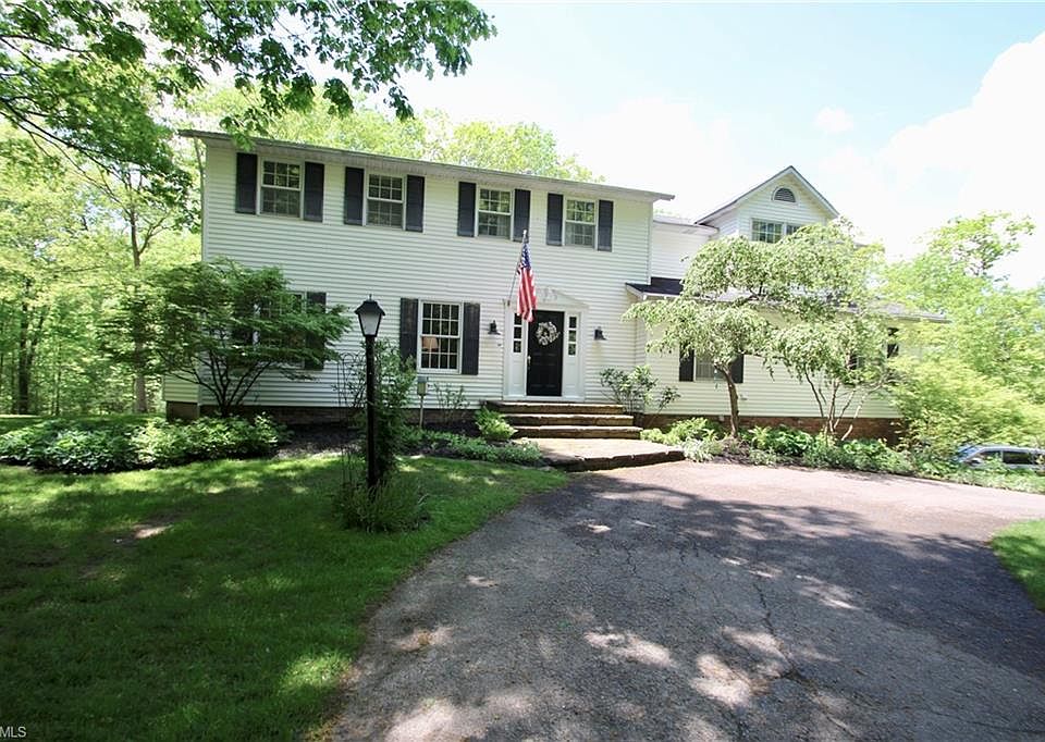 Classic colonial On 5 private wooded acres! Impressive entry into the large foyer which leads to a spacious living room with bay window, elegant dining room and sun room with views of the sensational setting. Updated kitchen with beautiful wood cabinetry, granite counters and large dining area which overlooks the family room featuring wood floors and attractive stone, wood-burning fireplace. A bedroom or office is available on the first floor with a convenient full bath and laundry room equipped for double laundry units. Four spacious bedrooms on the second level with 3 additional full baths. Newly carpeted master bedroom with fireplace and recently updated master bath with tiled shower and heated floor. The lower level has a finished recreation space, mudroom with built-in lockers and garage entry. Enjoy the views from most rooms or the deck. Quality features include crown molding, built ins, Pella windows, all appliances, and generator. 24x20 outbuilding! Geauga County septic inspection complete and passed.