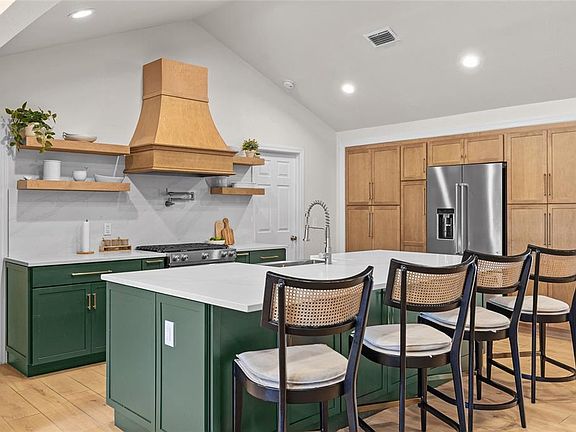 Warm inviting charmHot tubNeutral walls colorsStriking stone backsplashVaulted cathedral ceilingsGenerously oversized quarts islandBar and seating area