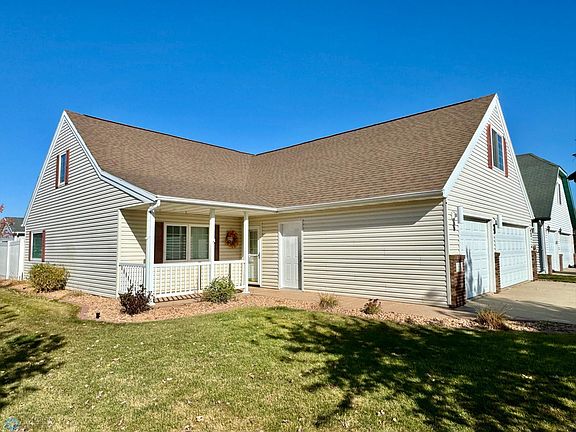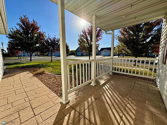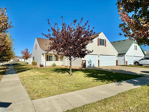 Welcome to the beautifully updated 4 bd, 2 bth, 3 stall slab on grade home. With an open floor plan right as you walk in with plenty of space to entertain. There are no steps to enter and it has 2 bedrooms, bathroom, living area, & laundry all on the main level. In addition to this you can head upstairs to find another family room, 2 large bedrooms, and bathroom. No basement worries in this home but still all the space you need! The primary bedroom even has a walk in closet that doubles as a storm shelter! You can enjoy the beautiful treed corner lot with private patio out back as well as enjoy coffee on the quaint front porch. All this with an attached 3 stall garage close to schools and all the amenities of West Fargo this is the perfect home to make your own!