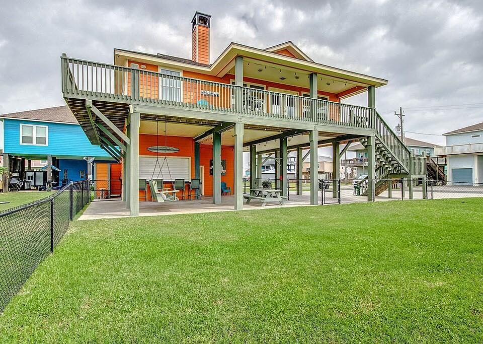 This beautifully remodeled home in the Tidelands subdivision of Crystal Beach is a top short-term rental producing home and ready for its next owner! Fully furnished 3-bedroom 2 bath coastal retreat, ready for immediate move in. Built in 2011 this home was designed for entertaining. Take in the breathtaking panoramic views of the ocean. Wrap around porch, covered patio, lower-level bar, outdoor shower and just walking distance to the beach! 1 additional bedroom downstairs with a twin over twin bunk and separate bathroom. Yard is fenced in and sale includes the additional lot next door Tax #7120-0005-0038-001