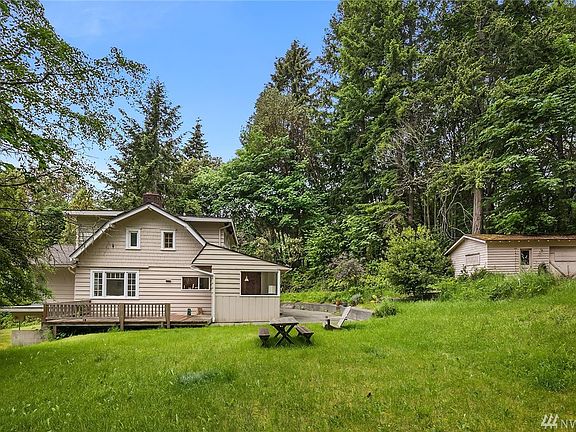 Turn-of-the-century beauty: This is one of the last vintage homes in a neighborhood of upscale properties on Vashon's lovely Quartermaster Drive. The 1907 classic has been sparingly updated over the years and is ready for restoration! Original wood floors and some original windows are still in place; a fireplace with insert warms the living room, and the dining room off the country kitchen is filled with light. A den/office and 3/4 bath are also on the main floor; a central staircase leads to three bedrooms and a full bath. The upper floor master bedroom has sweeping views of the harbor! The lower level features a rec room, half bath and lots of storage. The shy four-acre property is beautiful, with a fragrant lavender field in front, quiet woodlands in back and a garage just a stone's throw from the back door. The home faces south for all-day sun, with decks and patios for outdoor fun. Close enough to the harbor to hear the waves lapping!