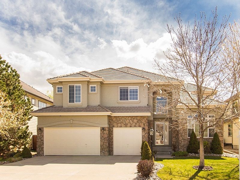 MLS #: 7352233 Located in the coveted Heritage Hills community of Lone Tree, you will find this lovely, comfortable family home. The home is situated on a great lot on a quiet street. As you enter the front door and large entryway of the gorgeous, stone and stucco house, you will find cathedral ceilings and a quiet study with built in shelving and French doors. The formal living and dining room areas are made for entertaining. High ceilings and the convenient layout make these rooms functional yet glamorous. Black appliances, dark granite countertops with stone backsplash and warm wood cabinetry tie nicely with the large, open family room's floor to ceiling windows. The sunny family room features a fireplace with large mantle and media center built-in with shelving for dcor, electronics or equipment. Hardwood floors throughout the kitchen and access to the back yard's large patio extends the space this home has to offer. At the top of the grand staircase a great master bedroom awaits. The 5 piece bathroom and walk-in closet includes a large soaking tub and separate sink areas. Three bright, additional bedrooms for children or guests-each with plenty of closet space and added details like wainscoting and custom paint are also upstairs. The basement level of the home is a delight with a large rec room area for entertaining and gaming. A bar with frig, wine cooler and dishwasher saves trips up and down the stairs. Gorgeous built-in shelving and cupboards keeps the area organized. The home includes professional landscaping in front and back and an oversized, three-car garage. Heritage Hills is a gated community located in Lone Tree. Near light rail, transit, shopping, dining, outdoor activities and fantastic public and private schools, this neighborhood has it all. Close by is Park Meadows Mall, Sky Ridge Medical center and quick access to both I-25 and E470.