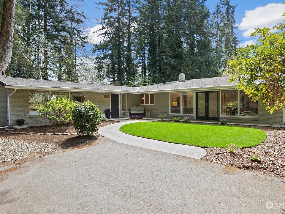 Rare midcentury modern masterpiece walking distance to dwtn Bothell! Tucked in a private park like setting, this 1 story w basement sits on a large 1/2+ acre lot & boasts an impressive 4446 +/- sqft of mostly SINGLE LEVEL living! Your main floor is a sprawling 3040 sqft w updated windows, electrical & plumbing (tankless hot water), 4 beds, 2.75 baths, a luxurious primary suite w custom wic & spa like en-suite upgraded w a wet room & heated floors, a chef inspired kitchen, 3 living areas, Cat5 & AC! Your partially finished 490 sqft basement has new carpets & 916 +/- sqft for extra storage, a root/wine cellar or to convert into living spaces. Enjoy multiple outdoor spaces w a patio, hot tub, garden, 3 outbuildings & RV/boat/trailer parking.