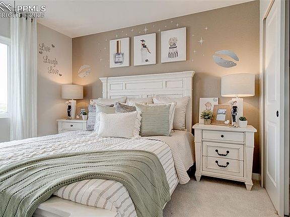 Beautiful two-story home with 3 bedrooms, 2.5 bathrooms, AC and a 2-car garage. Upon entry you will notice the tall ceiling that bring in a lot of natural light. The Great Room, Kitchen and Dining areas are adjoined helping to maximize your living space. Granite countertops in kitchen and LVP Hardwoods throughout. Kitchen includes GE Energy star stainless steal appliances (gas range, microwave oven and dishwasher), designer cabinets, large island with granite countertops and pendant lights. Patio located off kitchen. All bedrooms and laundry room are located on the upper level for a more traditional feel. The master suite offers a 5-piece master bath with a spacious walk-in closet. This home is under construction and will include front yard landscaping and rear fence. Home is part of established Banning Lewis Ranch Neighborhood with access to rec center, fitness center, pool and amenities such as parks, trails and water splash park. This home was designed for performance and energy efficiency and will receive a HERS score once complete. As a result, you should see saving on your utility Bills. Schedule your appointment for viewing today! PLEASE NOTE: Photos and videos are of different home/ same floor plan and finishes may vary.