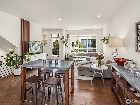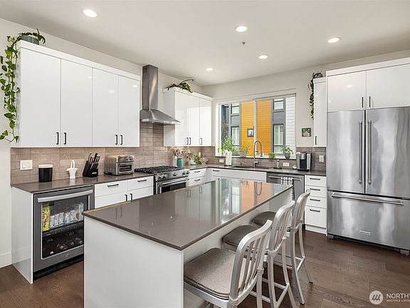 Spacious three-level townhome in the Northshore School District with 1,537 sq ft, 3 bedrooms, and 3 bathrooms. South-facing floor-to-ceiling windows bring in natural light. Flexible layout includes a main-level 3/4 bath and lower-level guest bedroom/office. Kitchen features slab quartz counters, large island, stainless steel appliances, under-cabinet lighting, and beverage fridge. Hardwood floors, wrought-iron railings, A/C, and EV-charger equipped 2-car garage. Private balcony and prime Bothell location with access to downtown, shops, and transit.