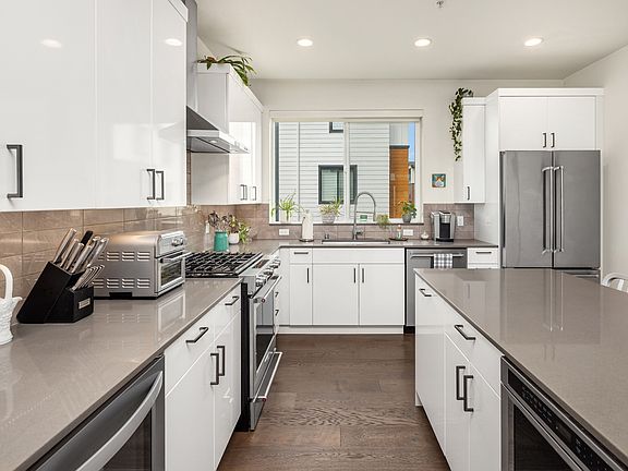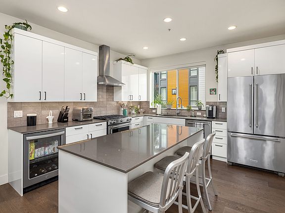 Spacious three-level townhome in the Northshore School District with 1,537 sq ft, 3 bedrooms, and 2.75 bathrooms. South-facing floor-to-ceiling windows bring in natural light. Flexible layout includes a main-level 3/4 bath and lower-level guest bedroom/office. Kitchen features slab quartz counters, large island, stainless steel appliances, under-cabinet lighting, and beverage fridge. Hardwood floors, wrought-iron railings, central A/C, and EV-charger equipped 2-car garage. Private balcony and prime Bothell location with access to downtown, shops, and transit.
