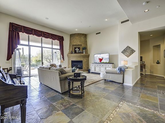Beautiful Edmunds/Toll Torreon Model located in the gated Golf Community of the Monument at Troon North. Spacious open great room plan. Newer appliances in Gourmet Kitchen w/Large Island & Breakfast Bar. Gas cook top, slab granite counter tops spacious pantry, built in desk & breakfast area. Kitchen open to Great room w/gas fireplace & surround sound. Slate floors used extensively throughout. Separate Office & Formal Dining Room w/buffet & wine cooler. Master Suite w/dual vanities, jetted tub, walk in shower & large walkin closet. Resort backyard w/flagstone covered patio w/heated pool, spa, water feature, & Built In BBQ. Desirable N/S exposure. The perfect home for entertaining. New A/C and Heating units in 2019. R/O replaced 4 years ago. Recent interior paint. Water softner replaced Dec