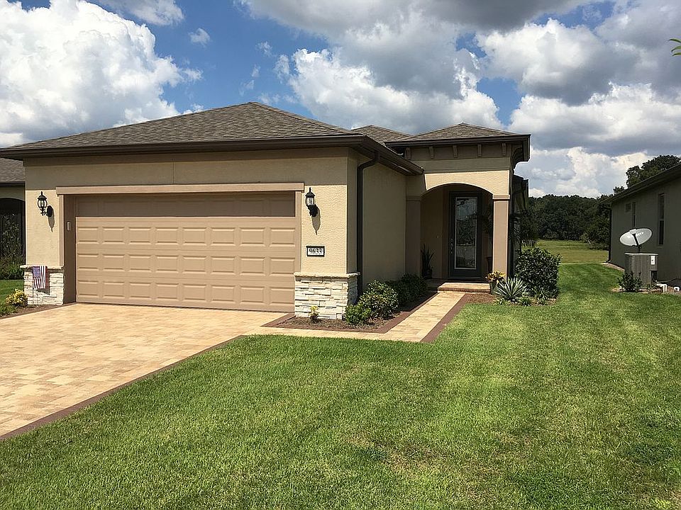 WILL WORK WITH AGENTS! IMMEDIATE OCCUPANCY! Offered here is a gorgeous Crest View Model Garden Home with 3 bedrooms, 2 bathrooms, and a 2+ car garage. It is located in Del Webb's Stone Creek Community in Ocala, Florida. This newer Garden Series Home has two important money-saving and work-saving features; all outside lawn maintenance and watering is included in the HOA fee. It is located on an upgraded lot with a beautiful pasture-view. This home is a 'unique property' because it has approximately $100,000 in extras and upgrades! This is a "diamond in the rough" for anyone searching for intrinsic value. When arriving at this lovely home site, you will see the attractive paver stone driveway, sidewalk and porch. Upon entry into this spacious home, you will notice the beautiful glass front door. Throughout the home, there are tile floors, plantation shutters, bull-nose counters, rounded wall corners and crown molding. The large kitchen has granite counters, tile backsplash, dark cabinets with pull outs, and stainless steel appliances. The kitchen also features a large island and added cabinetry. The master bedroom has a tray ceiling with crown molding and a peaceful view of the pasture behind the home. The master bathroom boasts a double vanity sink with granite counters, tiled step-in glass shower, a spacious walk-in closet with extra shelving, and a linen closet. The 3rd bedroom has been converted from a flex room into a bedroom. The guest bathroom has a tiled, step-in shower. The laundry room has a sink, counter-top and extra cabinets. The enclosed lanai (under a full shingled roof) has large, double pane, picture windows with solar shades. The remodeled lanai is a perfect spot for viewing the attractive pasture directly behind the house. The paver flooring adds a nice touch to the room and just outside the lanai door is a paver patio for any outdoor activities. The garage includes epoxy floor coating, and a laundry tub. Additional attic insulation has been added to both the garage and the lanai. Also, in the extended two-car garage, there is additional space for a golf cart or a workshop.