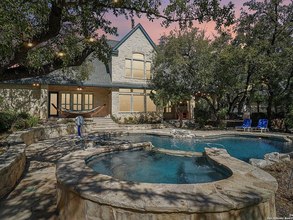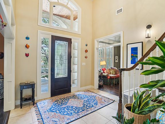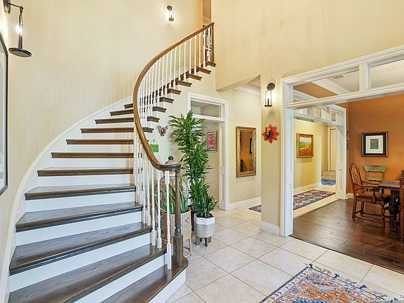 Stunning Stately Limestone Home on Acre Lot Surrounded by Majestic Live Oaks With over $250,000 in recent improvements, this magnificent home is a true gem in the heart of this small, gated Helotes community. Nestled on a lush, private acre lot, it offers a serene and luxurious retreat just minutes from everything, including La Cantera, USAA, Valero, UTSA, and the Medical Center. A large circle drive with stone columns welcomes you to the property filled with mature live oaks. The property also offers ample parking, accommodating up to five cars with ease, ensuring the circular drive remains clear for guests. Upon arrival, the two-story front porch-complete with a stained cedar ceiling-sets the tone for the elegance within. Custom French lanterns flank the front door, while sidelights and an expansive window above flood the entry with natural light. Step inside to a grand foyer with a curved wooden staircase and stunning architectural details. To the left, an inviting sitting room offers a cozy space to relax with a beautifully hand-carved mantel and two bonus closets for added storage. To the right, an elegant formal dining room features rich wood floors, exquisite crown molding, and transom windows. The large, bright kitchen is a chef's dream, showcasing custom antique white cabinetry and high-end KitchenAid, Thermador, and Miele appliances, including double ovens, a warming drawer, and dual pantries. Expansive picture windows provide a stunning view of the pool area, offering a tranquil backdrop as you prepare meals. Continuing through, you'll enter a spacious family room featuring a striking limestone fireplace and large windows that overlook the covered patio, outdoor kitchen, and deck. The backyard is a true oasis, with a maintenance-free Trex deck under 100 year old oaks and a view of the aquamarine pool creating a park-like setting that's perfect for outdoor entertaining or peaceful relaxation. Enjoy the added convenience of a mosquito misting system in the backyard, ensuring comfort during warmer months. Head into the primary bedroom, a luxurious retreat featuring its own private covered patio, coffered ceiling, and tranquil atmosphere. The en-suite primary bath boasts dual vanities with custom cabinets, ample storage, a soaking tub, a walk-in shower, and a closet with built-in shelving. Conveniently located just off the primary bedroom is a separate laundry room with custom cabinetry, a large sink, and plenty of storage space. On the first floor, you'll also find a beautifully appointed powder bath and a study with pocket doors, a built-in desk with cabinets, and wood flooring. Upstairs, there are three oversized bedrooms and two full baths that have been updated for a spa like experience. You'll also find a spacious game room, complete with a pool table and bar with a mini fridge. The large library is a standout, with bookshelves on three walls, an enormous closet, and stunning hardwood floors. This versatile space could be used as an art studio, home gym, hobby room, craft room, bedroom, or media room. The custom paint colors throughout create a resort-like feel. There are many special features including the loft in the bedroom overlooking the pool that is perfect for teens, grandchildren, or anyone looking for a cozy retreat. Many recent updates have been made, including a new roof, all-new HVAC systems with updated ductwork, insulation, air sanitation equipment, and newly resurfaced pool and spa. The home also has wood shutters throughout, outdoor lighting, insulated garage doors, updated lighting, sculptured carpet on the backstairs, bamboo flooring upstairs, and a central vacuum system. This home combines timeless beauty, modern luxury, and thoughtful updates to create a unique sanctuary in one of the most sought-after locations in the area