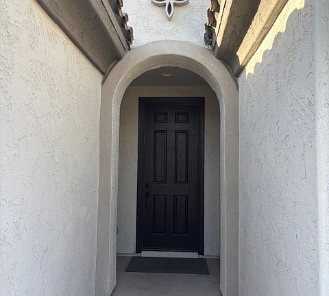 Extended covered patioGas cooktopDesert landscapingGranite counter topsWalk-in showerBeautiful white cabinetsStainless-steel appliances