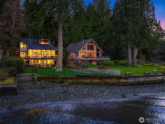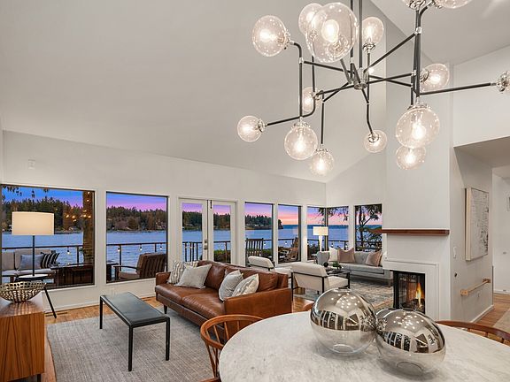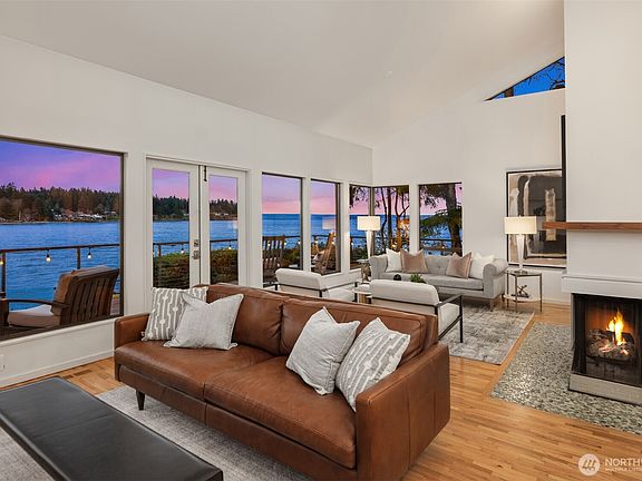 Architecturally stunning waterfront home with breathtaking Seattle skyline and Cascade Mountain views. This modern masterpiece features soaring vaulted ceilings, gleaming hardwoods, and an open layout designed for effortless living. Walls of windows flood the interior with natural light, enhancing the seamless indoor-outdoor flow. The gourmet kitchen boasts premier appliances, backlit cabinetry, and a sensor-lit pantry. The lower level offers a movie theater, wine cellar, and rec room. Remodeled baths with heated floors add luxury. Landscaped grounds include multiple decks, a private boat ramp, glass seawall, and beach access. Freshly updated 1-bed 1-bath guest cottage complete this retreat, located just five minutes from ferry and town.