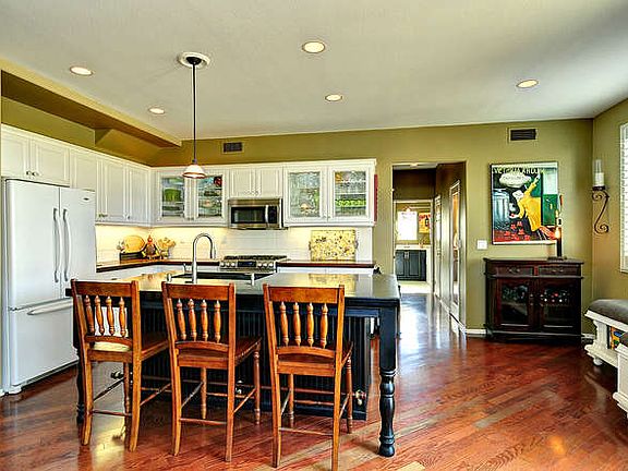 Enjoy sunset and mountain views from this beautifully upgraded 3 bedroom, 3 bath home. Located on a quite cul-de-sac with a private back yard and a custom fireplace created for elegant out door entertaining. Home is 2355 sq. feet. Upgraded features include solar, wood paneled entry, custom paint; plantation shudders high ceilings, & engineered wood flooring. The gourmet kitchen has custom cabinets, butcher block walnut counter top, custom Island with granite and built-in banquet seating, custom built in shelves in living room and dining area. beautiful fireplace in family room. Large media room with mountain views, master bedroom with views, custom walk in closet and Master bath. Outdoor Upgrades Solar - Owned by the home owner - a registered Edison Power Station Drought tolerant landscaping with lawn sprinklers and drip system 35' flag pole and rain gutters Custom Pergola with lighting and built-in sound system Custom outdoor fireplace Storage/gardening shed Downstairs Engineered wood flooring Built-in book shelves Wood paneled entry Upgraded lighting Plantation shutters Upgraded kitchen cabinetry with glass doors and lighting Custom black absolute granite island Butcher block walnut counter tops Upgraded appliances Custom fireplace faux finish Built-in banquet seating and storage Second Floor Engineered wood staircase and floors (office, front hall, master bath and walk-in closet) Upgraded walk-in closet with fitted cabinets Window treatments Upgraded master bath Extras Local alarm system and security cameras Attic stairs