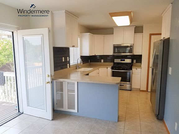 This two-story home offers over 1,500 sq. ft. of living space and is conveniently located near Silverdale, Bremerton, Naval Bases, shopping, dining, and more. The main floor features an open-concept kitchen and living area with a cozy fireplace and access to a covered front porch, perfect for relaxing or entertaining.