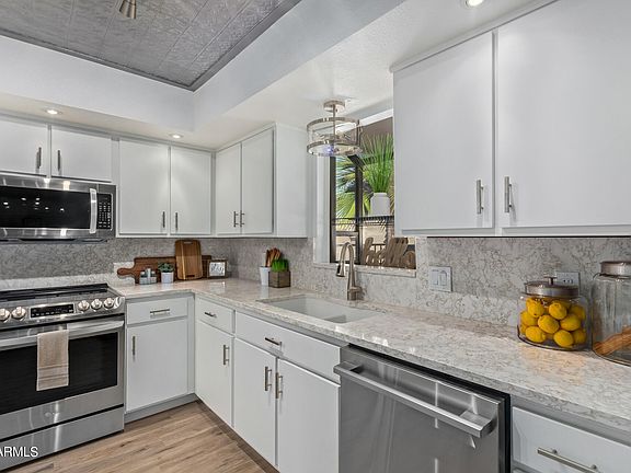 Highlights include new wood-look laminate flooring throughout (no carpet anywhere), new kitchen cabinets w/Quartz countertop and backsplash, new LG S/S appliances (including the refrigerator), new baseboards, gorgeous new bathrooms to include a ''curbless'' shower in the primary bath perfect for wheelchairs or walkers new interior paint, new ceiling fans and light fixtures in every room, a new roof, newly refinished garage floor/driveway/patio surfaces, newer windows w/plantation shutters, located on a private corner lot w/mature, low-maintenance landscaping to include desert, shade and citrus plants.