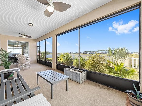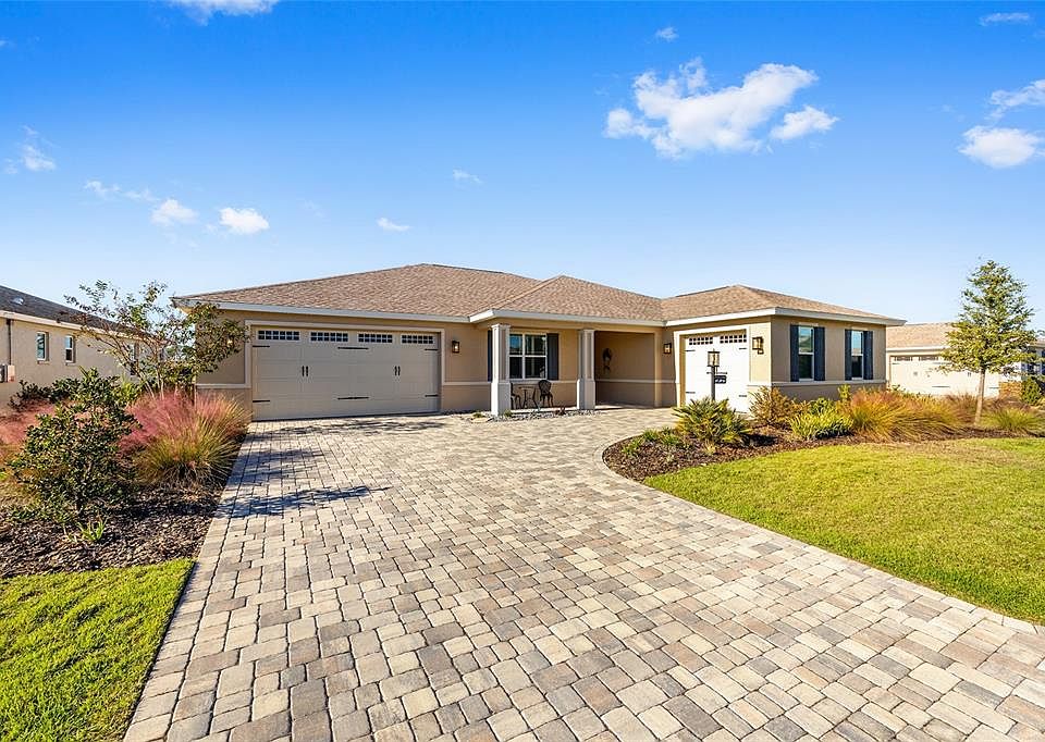 Backing up to tranquil green space with NO NEIGHBORS behind, this barely lived-in Dunbar model shows like a designer showcase. Located in the desirable Ashford and Balfour section of Candler Hills West, this modern smart home offers the perfect blend of elegance, comfort, and privacy. Step inside to discover a bright, open floor plan with large-format tile flooring, crown-molded tray ceilings, and abundant natural light. The great room flows seamlessly into the formal dining area, both accented by custom cornices and stylish recessed lighting. The gourmet kitchen is a showstopper, featuring staggered cabinetry with crown molding, soft-close drawers, stainless steel appliances, built-in oven and microwave, and a large granite island with pendant lighting. A custom wine bar with quartz countertops and high-end finishes adds a touch of sophistication, while the walk-in pantry provides ample storage. The primary suite is a private retreat featuring a tray ceiling, an en-suite bath with dual granite vanities, a zero-entry shower with bench seating, and a spacious walk-in closet that conveniently connects to the laundry room. Two additional bedrooms and full baths provide comfort and privacy for guests or family. Outdoor living is just as impressive. Triple sliding doors open to a screened and covered lanai, ideal for relaxing or entertaining. The home also features a vinyl-fenced backyard with peaceful green-space views, an oversized three-car split garage, a custom paver driveway and front patio, a water softener system, plantation shutters throughout, ceiling fans in every room, and upgraded tile bathrooms with high-end finishes throughout. Move-in ready and upgraded to perfection, this home truly defines luxury living in Ocala’s premier 55+ community.