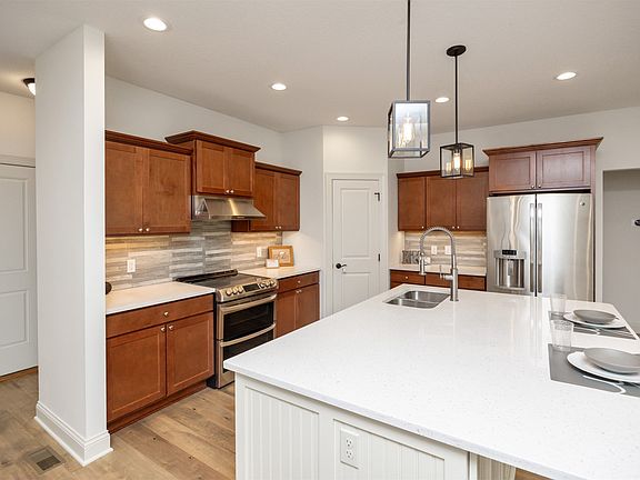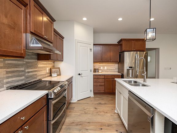Welcome to this one-of-a-kind ranch filled with thoughtful custom touches! Over 1800 sq ft on the main level and over 3500 sq ft of total finish, and a desirable 3 bedrooms up and 1 bedroom down floor plan, makes this home stand out from the rest! The heart of the home features a large island and dual oven electric range, perfect for family or friend dinners, homework help, or weekend baking projects. Main-level laundry room is conveniently tucked near the bedrooms, while updated flooring and stylish bath fixtures add a fresh, modern feel. Step outside 3 panel sliders to a covered deck and fully fenced yard with a garden and stamped concrete pad that backs to prairie space, ideal for playtime, pets, or peaceful evenings under the stars. The lower level is its own retreat, designed to flex as a guest suite, office, homeschool setup, or hangout space, complete with the comforts of the main level. You'll love the ample sized storage room, bonus pocket office as well as adorable child reading nook. With 4 bedrooms and 3 bathrooms, a 3-car garage, front porch, and a community filled with trails and playgrounds, this home was made for both everyday living and memory-making. Come see why it's so easy to imagine living here!