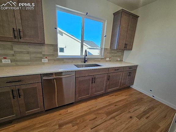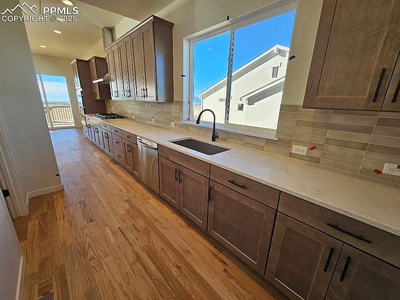 Welcome to the ever-popular Branson floorplan in Timber Ridge, where urban meets luxury. Designed with comfort, convenience, and modern living in mind, this home features a covered Deck overlooking your walk-out lot that backs up to the Southern high plains of Colorado. This home is ideal for outdoor living and family hosting. Key highlights include a large 4 car Garage, 10-foot ceilings, large windows, and a gourmet kitchen with a large walk in pantry just off the back kitchen, yes there is a back kitchen complete with additional prep sink and a 2nd dishwasher. The open kitchen, dining, and great room seamlessly connect, with a gas fireplace reaching the ceiling and natural light flooding in. The main level also offers a study, a bedroom, and a primary suite with a spa-inspired 5-piece bath, dual walk-in closets, and direct access to the laundry room, with a sink, key drop and boot bench. Step outside to the rear deck, where you can enjoy the Southern sun and peaceful surroundings. The finished basement includes a rec room, two additional bedrooms, and a 3/4 bath with dual sinks, perfect for family or guests. The upgraded wet bar adds to the entertainment possibilities. High-end finishes include real oak hardwood flooring, raised-height vanities, and full A/C and radon systems. The Metro District fees cover sewer, community fees, and water usage (up to 5,000 gallons). The west-facing front and spacious lot offer privacy and convenience, with easy access to local amenities. The Branson plan blends luxury and practicality, perfect for family life and entertaining. Don’t miss the chance to make this exceptional home yours! This home will be ready December 2025, be in before Christmas!