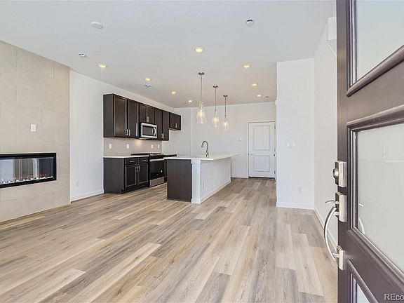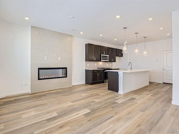 Brand new MOVE-IN READY townhome in the highly sought-after Prospect Village at Sterling Ranch community! This stunning 'Early Colorado' two-story townhome boasts modern elegance and convenience, offering the perfect blend of comfort and style. As you step onto the covered front porch, you're greeted by a sense of warmth and charm. The living room features a contemporary fireplace with floor-to-ceiling tile surround creating an inviting atmosphere for cozy evenings with family and friends. The main and upper levels boast impressive 9-foot ceilings enhancing the sense of openness and airiness throughout the home. Convenience is key with a large upper-level laundry room, ensuring effortless chores and organization. Both secondary bedrooms include walk-in closets providing ample storage space for all your needs. The heart of the home lies in the stunning kitchen featuring 42" maple smoke cabinets, quartz countertops, stylish tile backsplash, and stainless Whirlpool® appliances including a contemporary gas range. Retreat to the primary bedroom suite where relaxation awaits as you enjoy the oversized walk-in shower with bench, and revel in the abundance of space within the walk-in closet. Outside your door, discover a world of adventure and recreation with access to amazing community amenities and 30 miles of scenic trails. Whether you're seeking outdoor exploration or simply enjoying the serenity of nature, this community offers something for everyone. Don't miss out on the opportunity to make this move-in ready townhome your own. Schedule a showing today and experience the epitome of modern living in Sterling Ranch!