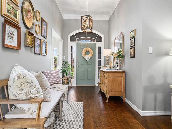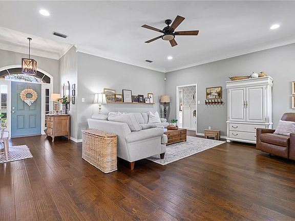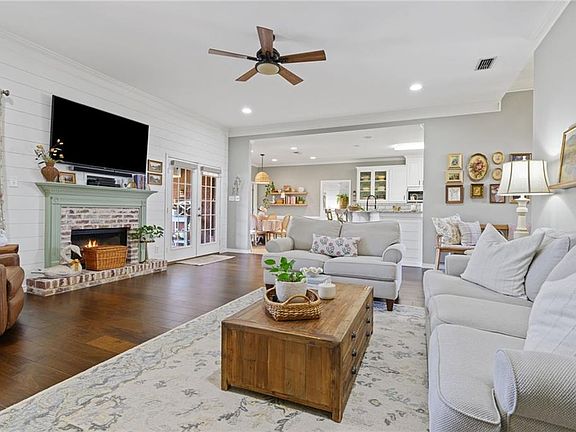 Step inside this beautifully designed home where cozy charm meets everyday functionality. From the moment you enter, you’ll notice the inviting blend of natural light, elegant finishes, and thoughtful details that make this home feel truly special. The spacious living area features rich wood floors, high ceilings, and a neutral palette that creates a warm and welcoming atmosphere. The adjoining dining room, with its large arched window and custom wainscoting, is perfect for family gatherings or relaxed Sunday brunches. The kitchen is both stylish and practical — complete with crisp white cabinetry, subway tile backsplash, granite countertops, and stainless-steel appliances. An eat-in breakfast nook and bar seating offer plenty of space for casual dining and entertaining. Retreat to the serene primary suite featuring tray ceilings, a walk-in closet, and a beautifully styled ensuite. Additional bedrooms are bright and versatile, ideal for family, guests, or a home office. The laundry room is a showstopper of its own — with designer wallpaper, custom cabinetry, and wood countertops that make even chores a delight. Step outside to the covered porch overlooking a fenced backyard designed for gatherings and quiet evenings alike. With space for outdoor dining and a cozy fire pit area, it’s the perfect extension of your living space. If you’re looking for a home that blends classic Southern charm with modern updates, this one is a must-see.