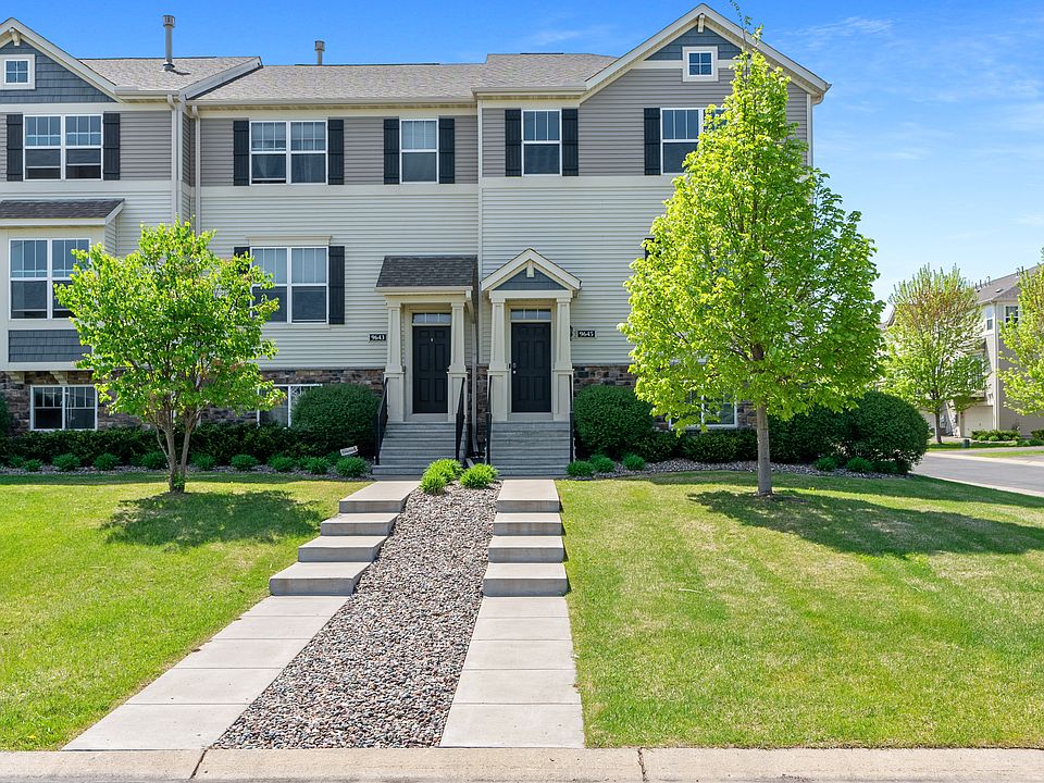 Enjoy outdoor living on the private balcony overlooking the neighborhood green space, plus an attached 2-car garage with extra driveway parking. HOA fees cover snow removal, lawn care, water, and trash. Additional amenities include in-unit laundry, modern finishes throughout, and a quiet walkable community with a central park and gazebo. Close to Hy-Vee, Cub, Target, and multiple quick-service restaurants, with easy access to Hwy 610 for commuting. Move-in ready now.