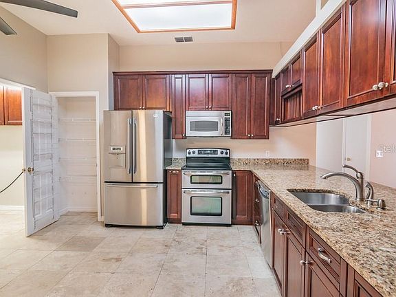 Beautiful 3 bedroom, 2 bathroom, pool home in Tampa. Arriving at this home, you are welcomed into a tiled foyer. To the right you have a large dining room with laminate floors, high ceiling, and a large picture window to allow for natural light. Continuing into the home, you have a spacious kitchen that features solid wood cabinets, stainless steel appliances, granite countertops, closet pantry, and a large breakfast nook. Overlooking the kitchen is the large family room with laminate floors, ceiling fan, and 2 sliding doors leading to the lanai. The primary bedroom of the home boasts a huge walk-in closet with built in shelves, private access to the lanai, and an en suite bathroom with dual sinks, soaking tub, and a walk-in shower. The home is complete with 2 additional bedrooms and full bathroom. Outside, you can enjoy the Florida weather in the private pool with lanai. Located in the highly desirable Pebble Creek neighborhood in New Tampa, you are convenient to shops, dining, and I-75 for an easy commute to Tampa and surrounding areas.