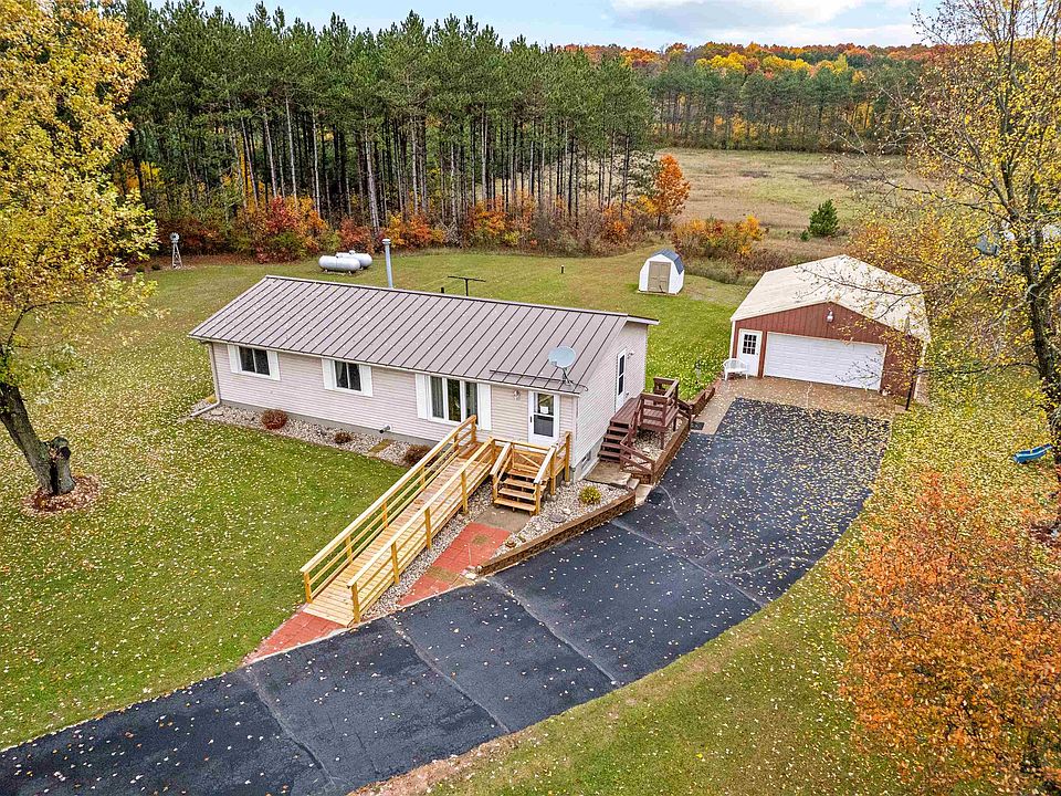 Welcome to this meticulously maintained ranch home nestled on a spacious 19+ acre property in a peaceful rural setting. This delightful residence features 3 bedrooms, 1.5 bathrooms, and a convenient first-floor laundry. With a over-sized 2.5 car detached garage and a generous 26x36 pole shed, there's ample room for storage and projects. Enjoy the durability of the metal roof and the convenience of two 500-gallon LP tanks. Don't miss the chance to own this great location gem!