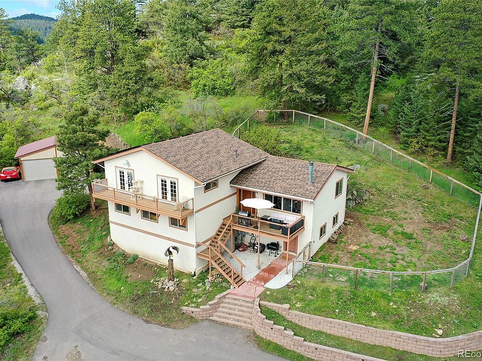 Escape to your private oasis perched at the top of Yegge Mountain, with breathtaking, panoramic views of Denver, Chatfield Reservoir, and surrounding mountains. This foothills retreat offers complete privacy while being just 35 minutes from downtown Denver. Outside, enjoy 10 serene acres zoned for livestock, and a private campsite with jaw-dropping views, just a minute walk from the house. Inside, the home features vaulted ceilings, hardwood floors, a large open kitchen with modern appliances, 2 dining areas, 2 living rooms, and 5 bedrooms plus a bonus room with built-ins that can be your library, home office, or converted into a 6th bedroom. Updated primary suite features vaulted ceilings, designer bath with custom vanity, two-person cedar tub and walk-in travertine shower, and a private deck with endless views. All this plus an unfinished basement that can be your work shop, storage area, or finish for 800 additional sq. feet of living space! A laundry list of upgrades includes a newly-paved driveway, detached two-car garage, fully-owned solar system with Tesla Powerwall backup, Class 4 shingle roof, high-speed internet from Neteo, heavy duty dog fencing designed for large breeds, and Hearthstone wood stoves for whole-house heating. Enjoy the best of mountain living with modern conveniences and proximity to Conifer, Red Rocks, hiking trails and state parks, and the city of Denver.