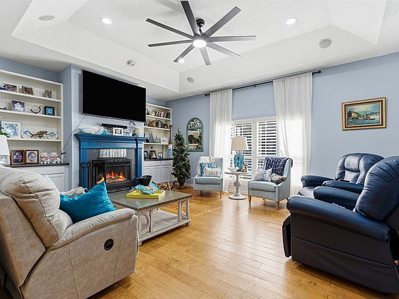 Inside, the home features RICH WOOD FLOORS, PLANTATION SHUTTERS, CROWN MOLDING, WAINSCOTING, and a well-balanced layout designed for both everyday living and entertaining. The UPDATED KITCHEN is equipped with NEW APPLIANCES, a WALK-IN PANTRY, and ample cabinetry, flowing seamlessly into the main living areas. The family room is anchored by a WOOD-BURNING FIREPLACE, BUILT IN CABINETS AND SHELVES, AND A WET BAR; while the owner’s suite offers a GAS FIREPLACE for added comfort.