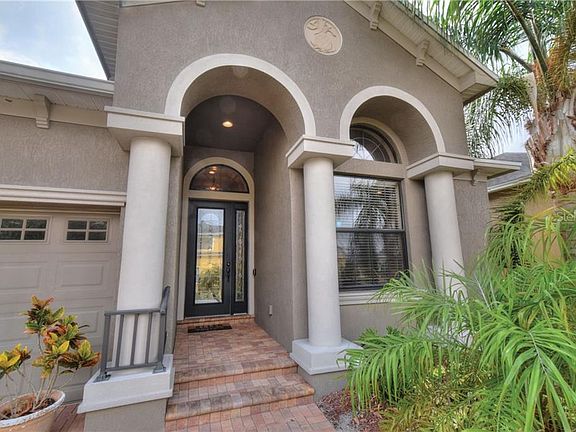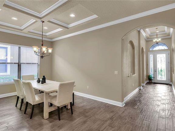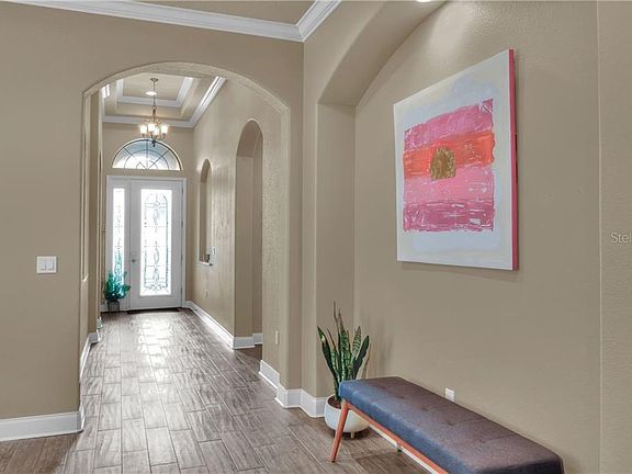 Beautiful gated Christina Chase custom built Robert Nunez home in South Lakeland! As you make your way in the home, you will find yourself under a lovely grand entrance with high tray ceilings, crown molding, and wood tile throughout the space. The front of the house boasts 2 bedrooms separated by the entrance hallway, an upgraded full tub-shower bathroom, an entire office and a laundry room with a deep sink and cabinetry amenities. Proceeding forward, the living space offers a spacious formal dining room, lined with custom wall inlays and immersed with pools of natural light - an ideal space for any hostess. The opposite of the wall lays the striking kitchen with light wooded cabinetry, slow-closing doors, and drawers as an expansive all among a quintessential island. The kitchen opens to the living room, providing ample open-concept space. The sliding doors off the living space open up completely, inviting the outdoors in! The paver and screened-in lanai create an extension of the living space on bright, beautiful Florida days! The master bedroom suite sits off the living room with double door entry to the master bathroom, large garden tub, walk-in shower, and his and her vanities. For just $212/month, the HOA fee includes full lawn maintenance, fresh exterior paint every 7 years (next year), and a new roof every 17-20 years!