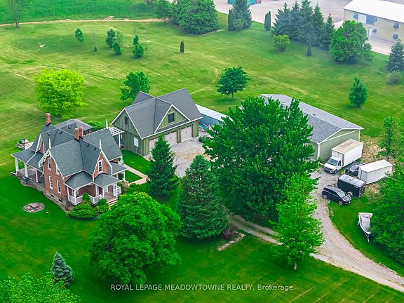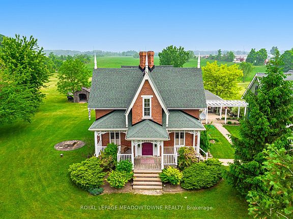 Nestled on a picturesque 46.5-acre property, this breathtaking century home seamlessly blends historic charm with modern conveniences. Spanning approximately 2,600 sq. ft., this bright and inviting home is filled with natural light, highlighting its many original features, including a stunning handcrafted staircase, wide plank hardwood floors, intricate trim work, 2 gas fireplaces, and beautiful stained glass windows. The thoughtfully designed layout offers 3 spacious bedrooms, including one with a private balcony overlooking the scenic landscape. A second-floor laundry and home office provide convenience, while the elegant 5-piece bathroom adds a touch of luxury. Enjoy the beauty of the outdoors from any of the three covered porches, with the back porch offering serene views of the pond and vegetable garden. For those who appreciate additional space, this property offers a two-story 3-car detached garage with a loft apartment featuring two bedrooms and a rough-in for a three-piece bath, ready to be completed as an in-law suite. Additionally, a 60x30 detached garage provides ample room for storage, a workshop, or hobby space. Completing the outdoor amenities is a covered dining and BBQ area, perfect for entertaining and enjoying the scenic surroundings. Previously used for farming wheat, the expansive land offers endless possibilities. Located in the heart of the Niagara Region, you're just minutes from local markets, scenic hiking and biking trails, world-class wineries, breweries, golf courses, and top-tier dining. Plus, with easy access to the QEW, commuting is a breeze. This rare and remarkable property is a must-see don't miss your chance to own a piece of history in an unbeatable location!
