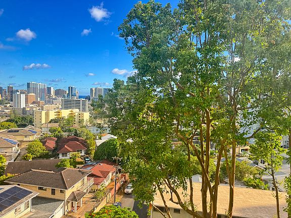 Rarely available top floor condo is here for you to make it yours. Come home to a serene retreat that offers breathtaking views of the city, ocean, and mountains. This upgraded 2 bedroom 2 baths unit with 2 covered parking is situated in a secure building in the heart of Honolulu. Expansive floor-to-ceiling glass windows and doors span the entire length of the apartment. The southern-facing exposure allows abundant natural light and offers a partial ocean view, providing a picturesque setting for sunsets and Friday night fireworks over the skyline. Residents can enjoy the inviting swimming pool and BBQ area with seating, ideal for relaxing or entertaining, all set within beautifully landscaped grounds highlighted by vibrant rainbow eucalyptus trees. Just minutes from downtown Honolulu, this is truly a wonderful place to call home! Enjoy the modern kitchen and bathrooms, new stylish vinyl plank flooring, fresh paint throughout, and the convenience of an in-unit washer and dryer. Take in lush treetop views and refreshing cross breezes from every room and unwind in the peaceful surroundings. Highlights include a responsive resident manager and guest parking. Centrally located near shops, restaurants, and freeway access, this home offers the perfect balance of comfort and convenience.