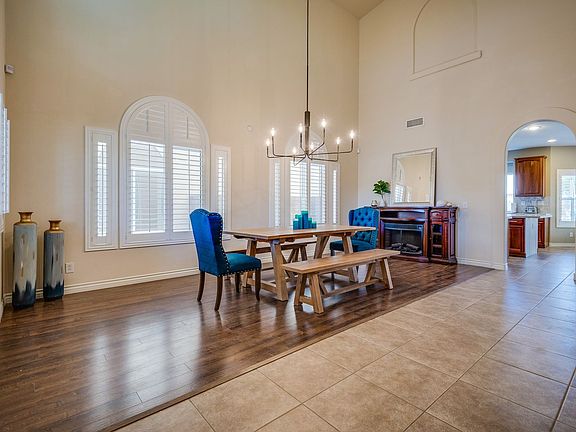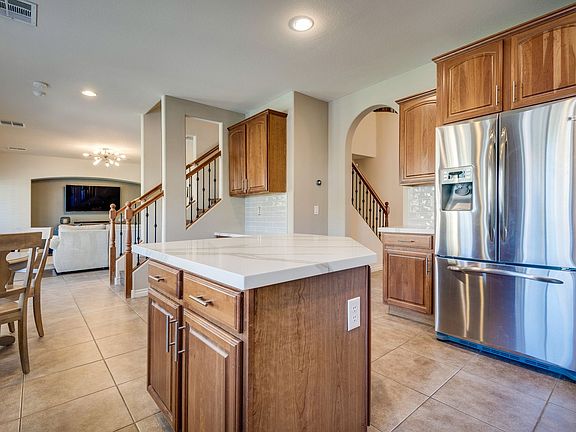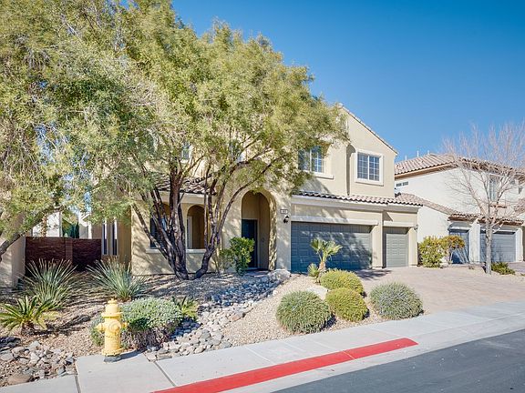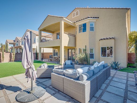 Gated single family home with 4 bed 3 baths & 3 car garage in prime Henderson location. Covered entry opens to cathedral style dining room with wood-like flooring & open staircase with wood & wrought iron banister. Upgraded kitchen with tile backsplash, breakfast nook, and stainless steel appliances. Separate cozy family room leads to highly upgraded, spacious, rear yard with covered patio, fireplace, river walk and synthetic grass. Double entry to primary bedroom with vaulted ceilings, private balcony and en suite oversized bathroom with dual sinks, separate soaking tub, walk in shower and closet. Fourth bedroom can be an optional bedroom or office. Shutters & ceiling fans throughout.