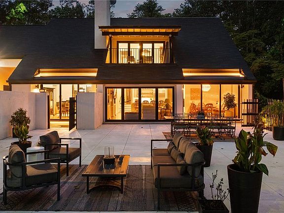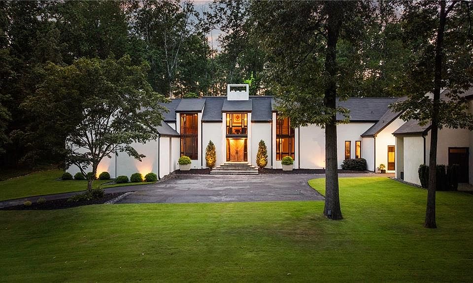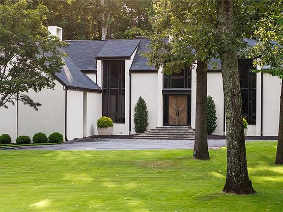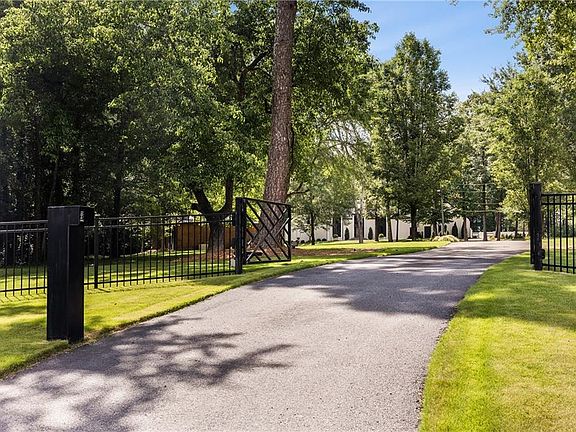 Tucked discreetly behind gates on nearly 11 pastoral acres, Northwind is a residence of remarkable provenance and rare scale. Conceived by celebrated architect Henri Jova and commissioned by philanthropist Peter Abreu, this modernist estate is a masterwork of spatial drama, quiet luxury, and architectural clarity, an extraordinary convergence of form and function, history and modernity. Approached via a long, tree-lined drive, the home reveals itself slowly, with monumental geometry set against a backdrop of hardwood forest and rolling lawns. Inside, grandly scaled rooms, originally designed to accommodate heirloom furnishings, unfold in a series of dramatic volumes. A sunken living room crowned by a soaring 30-foot ceiling is encased in walls of glass, dissolving the boundary between interior and landscape. Clean lines and expressive materials reflect Jova’s signature style, emphasizing transparency, proportion, and connection to site. The residence has been thoughtfully reimagined by its current owner, balancing reverence for the original architecture with nuanced modern updates. Living, dining, and entertaining spaces are fluid and generous, anchored by a re-envisioned kitchen finished in terrazzo and framed by retractable Pella glass doors that open seamlessly to the expansive outdoor terrace and pool. Overlooking the pool is a fully self-contained A-frame guest house, a striking architectural moment in its own right. With its original angular roofline preserved, the guest house offers a full kitchen, living room, bedroom, and full bath, providing a true secondary residence that feels both private and connected. The primary suite occupies its own wing and functions as a private apartment, complete with sitting room, study, morning kitchen, dual dressing rooms, and a separate bedroom or yoga space. A second level offers three additional bedrooms and a full suite of recreational spaces, including a media lounge and billiards room, each oriented toward the surrounding grounds. Zoned agricultural, the property offers flexibility for equestrian use or curated landscaping, and includes a three-car garage, detached studio structure, and additional outbuildings. Despite its seclusion, Northwind sits just minutes from Canton Street, The Avenue East Cobb, and Avalon, offering an uncommon level of privacy without sacrificing proximity to the best of North Atlanta. An architectural landmark, a legacy estate, and an exceedingly rare land offering, Northwind presents a once-in-a-generation opportunity to own a true cultural and architectural artifact in one of North Atlanta's most accessible and desirable suburbs.
