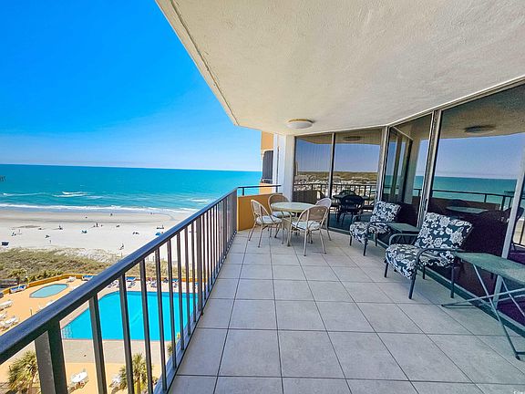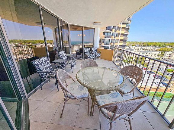 Experience breathtaking views down the Atlantic coastline into North Carolina! Just step out onto one of the balconies and watch the waves roll in! This lovely two-bedroom, two-bath residence is sold furnished with wood, tile, and carpet flooring, stainless steel appliances, custom cabinets, and granite countertops in the kitchen and baths. Large primary suite with plantation shutters, walk-in closet, split bedroom floor plan, and smooth ceilings throughout. Featuring an updated open floor plan, with panoramic ocean views, great for entertaining. Located in the prestigious Maisons sur Mer, this oceanfront tower has it all! Newly remodeled lobby with women's sauna, game room, tennis and basketball court, underground park, and 24-hour security. Perfect for a primary residence, second home or rental option. In the heart of Myrtle Beach and close to everything!
