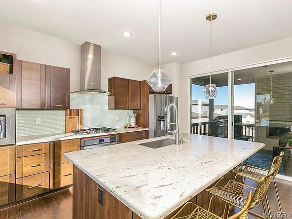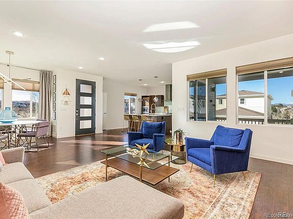Live your best life in this stylish 4 bed/2.5 bath Shea 'Spaces' home with easy access to the best of Highlands Ranch! Refreshed for the New Year with kitchen and primary bath wallpaper removed! Panoramic mountain views greet you at every turn as this special home is situated on an oversized, walkout corner lot. Contemporary in style and perfectly move-in ready, you're welcomed to an expansive great room with West Elm lighting, luxe and bright chef's kitchen with huge center island and warm hardwood floors throughout. Perfectly situated between the kitchen and great room is a West-facing covered deck, made for enjoying majestic sunsets and dining al fresco. A convenient powder room can be found on your way to the second level. The primary suite is a spacious retreat with a chic accent wall, designer lighting and ensuite bath. A large walk-in closet sits adjacent to a spa-like shower and vanity with double sinks. Two additional bedrooms with views, a full bath and laundry room with washer/dryer included, complete the second level. The finished basement is certain to check all the boxes with an additional family room/workout space, utility room with storage and sink, and massive bedroom - big enough for a king bed with built-in bookcases and desk nook! The basement also provides access to the garage and landscaped, pet-friendly turf backyard - another wonderful option for enjoying the Colorado sunshine with friends and family! The secondary HOA maintains all exterior common space including snow shoveling up to your front door and maintenance for the beautiful pocket park just beyond. Loaded with recent updates like a new refrigerator, garbage disposal, sump pump, garage door springs, interior paint, smart smoke detectors and thermostat for more worry-free living. With easy access to C-470, UC Health, Children's Hospital, and walking distance to Dad Clark Park, Valor High School and the best restaurants in Highlands Ranch - this home has everything you’re looking for!
