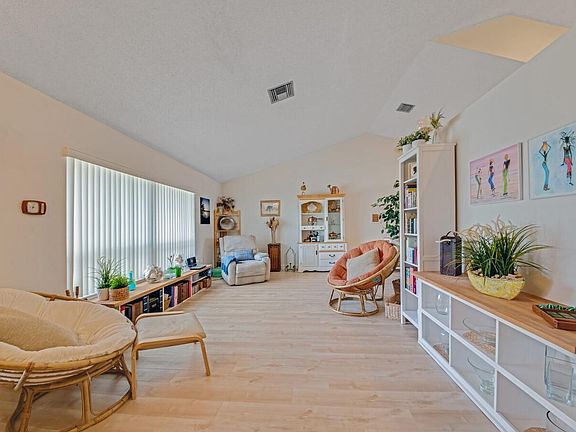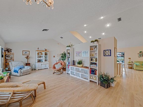 Make your dream home a reality in this 4 bedroom, 2 bath pool home. Upon entering this well-appointed home you will notice the vaulted ceilings and the abundance of natural light. The dream kitchen offers classic white cabinets, pull out drawers, butcher block countertops, stainless steel appliances, a pantry, snack bar and a breakfast nook. Spacious primary retreat with a slider to patio and his and hers closets. Enjoy your tropical paradise on the screen enclosed patio that overlooks the custom pool and serene lake view. Neutral flooring, no carpets, smooth walls, accordion shutters and a screen enclosed entrance are just a few highlights of this home. Located close to shopping, dining, entrainment, 'A' rated schools and major highways. Sun Valley provides first class amenities that includes a resort style pool, tennis and a play area.